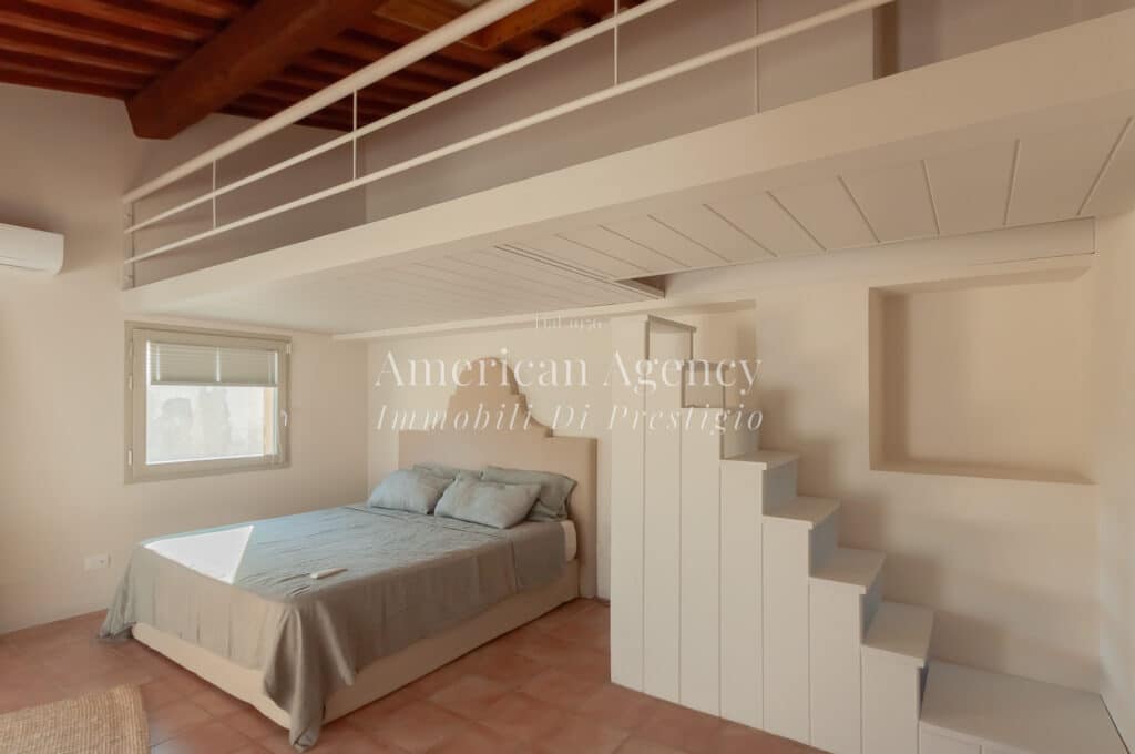 Al primo piano si trova la zona notte, composta da una camera padronale con soppalco e bagno ensuite, due ulteriori camere matrimoniali entrambe con accesso diretto alla terrazza panoramica, e un secondo bagno finestrato. Gli spazi sono ampi e ben distribuiti, garantendo privacy e comfort a ogni ambiente.