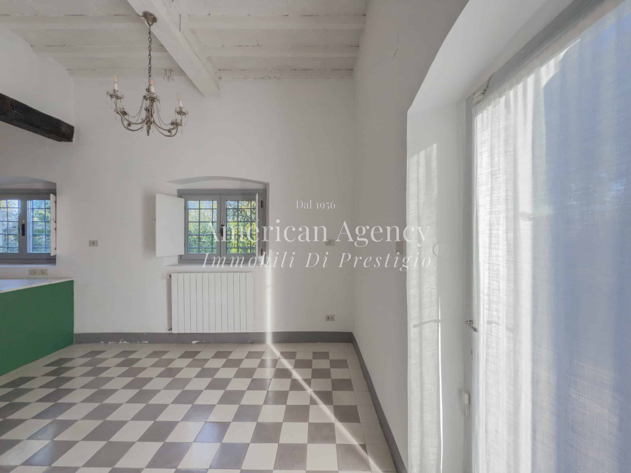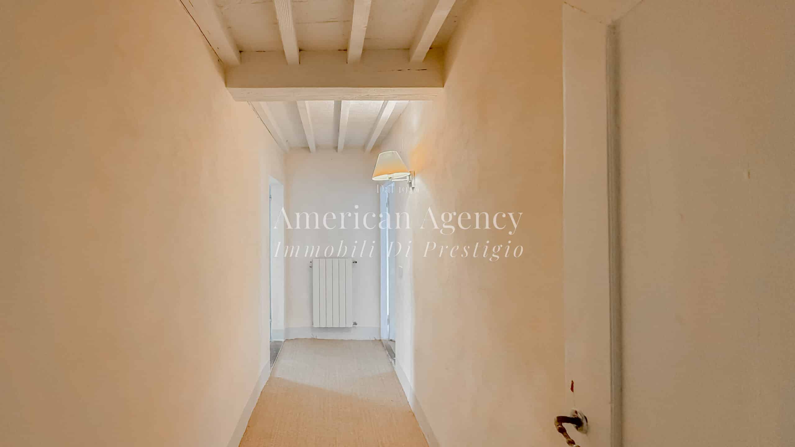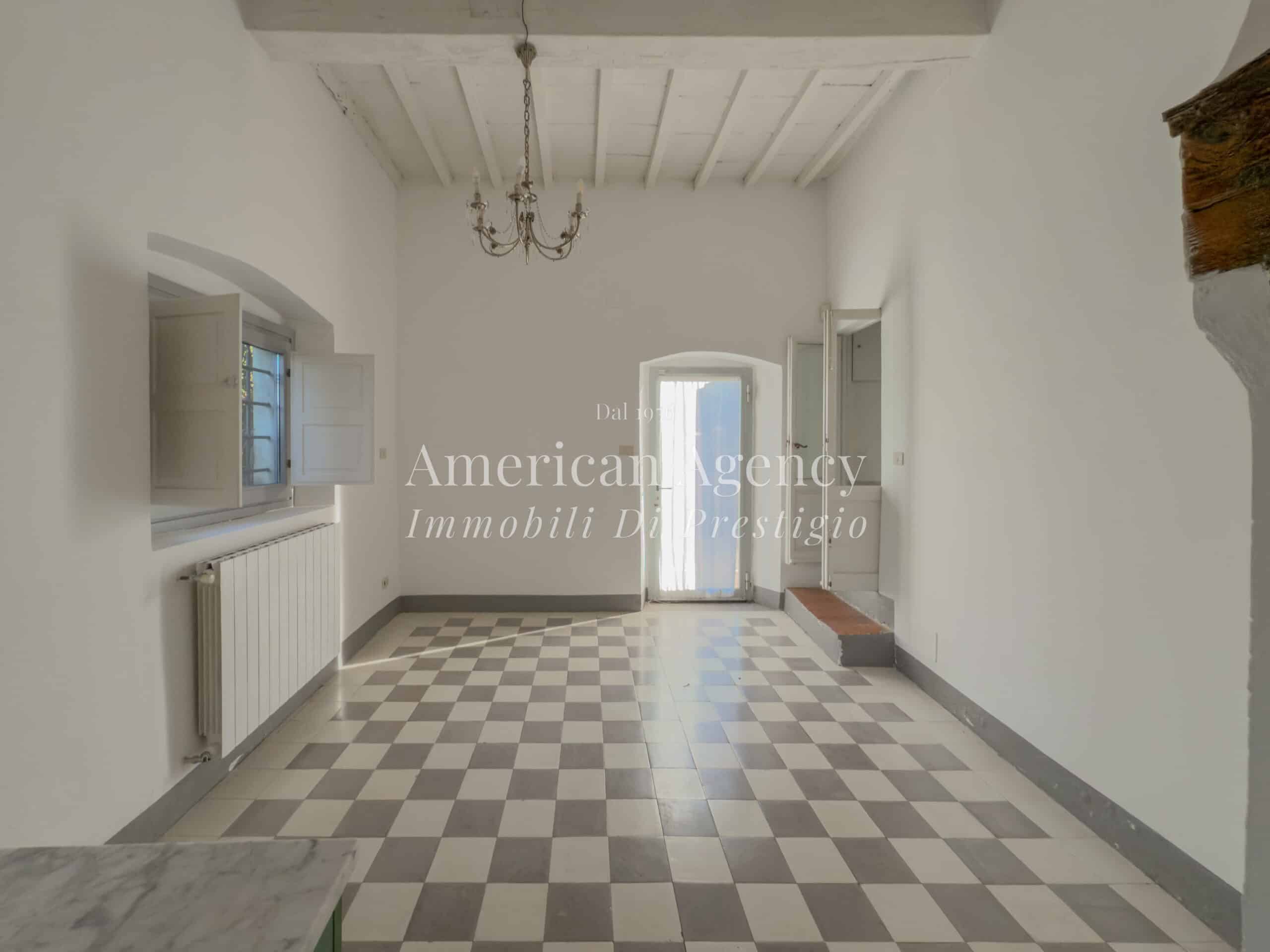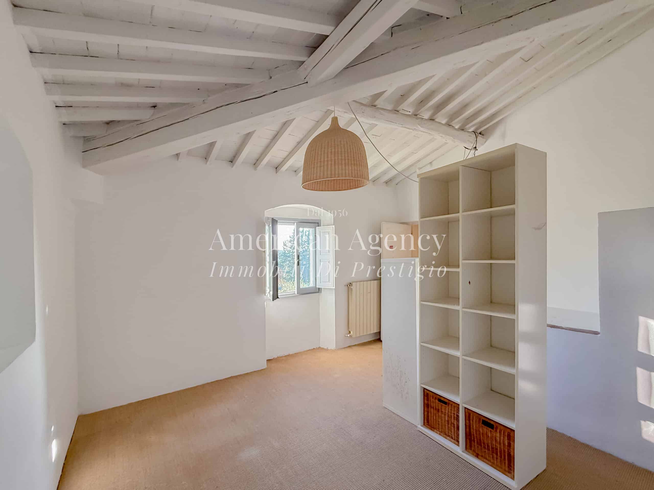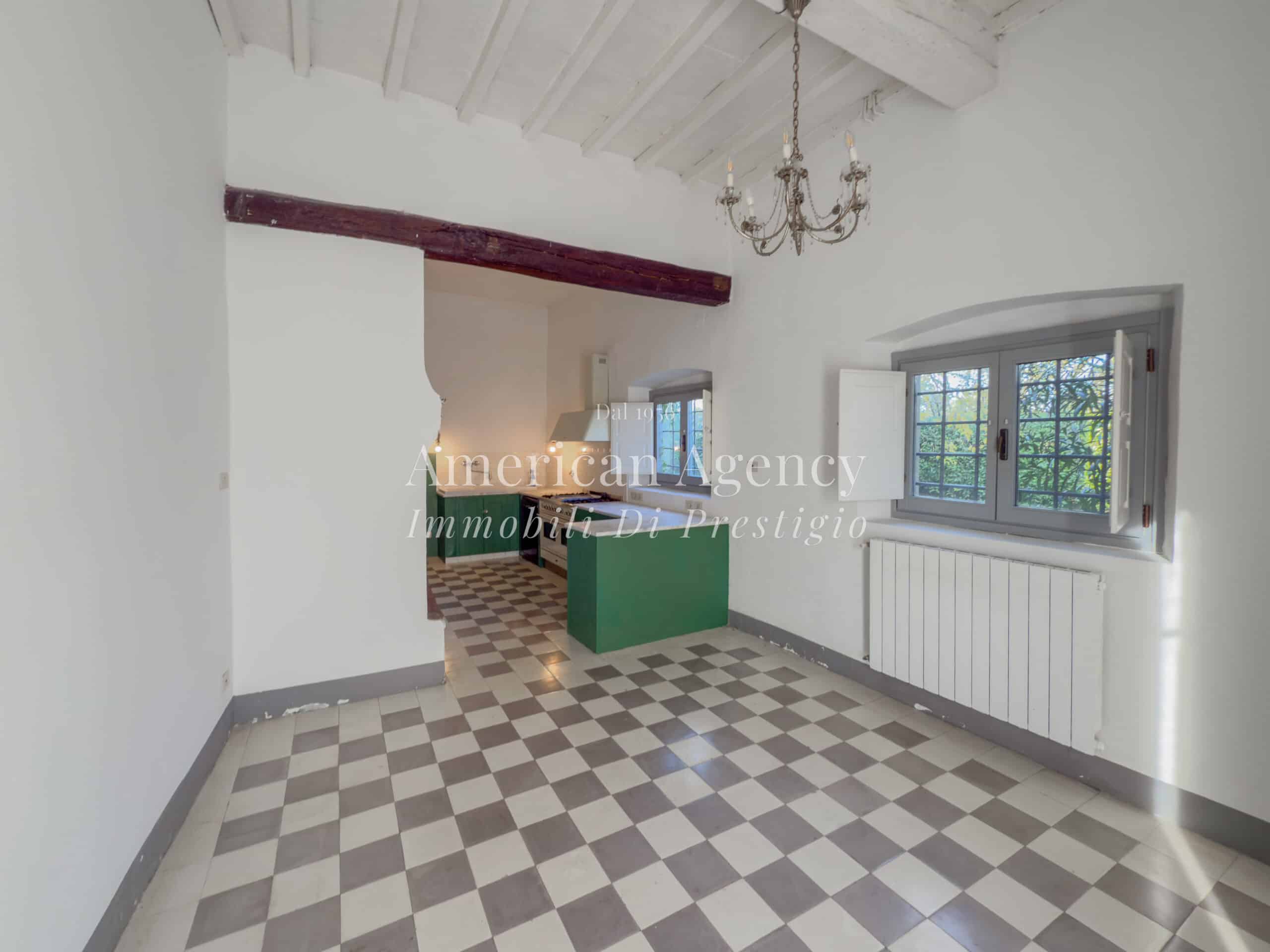 La casa colonica conserva il fascino autentico delle dimore rurali toscane, con travi a vista, pavimenti in cotto e caminetti originali, sapientemente integrati con comfort moderni come aria condizionata e riscaldamento autonomo.