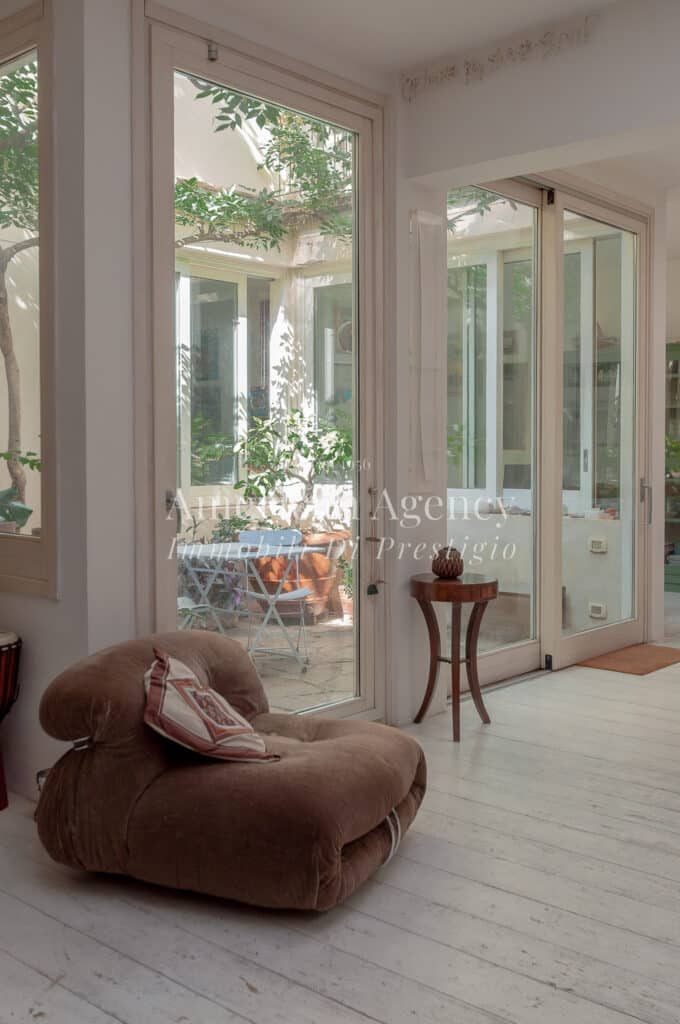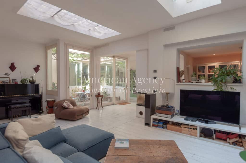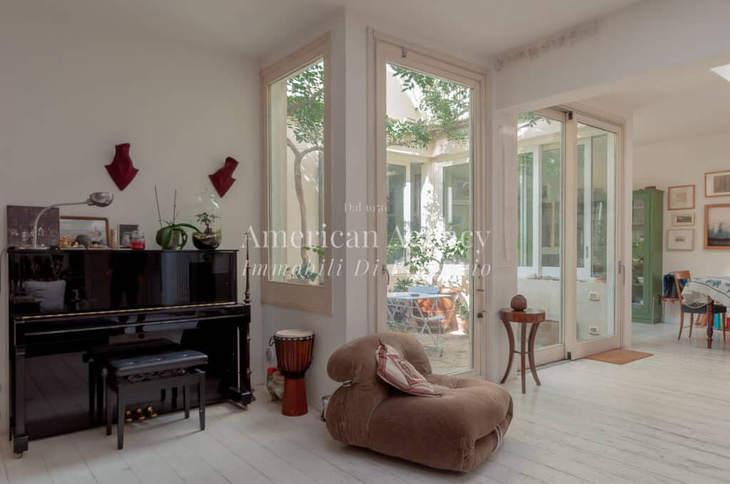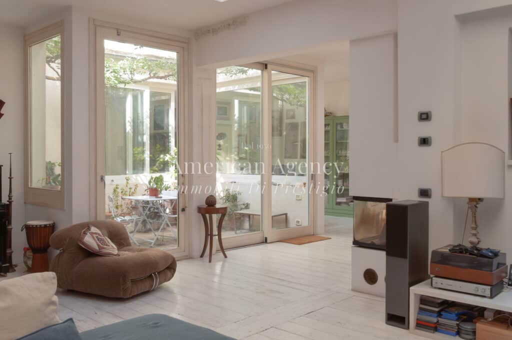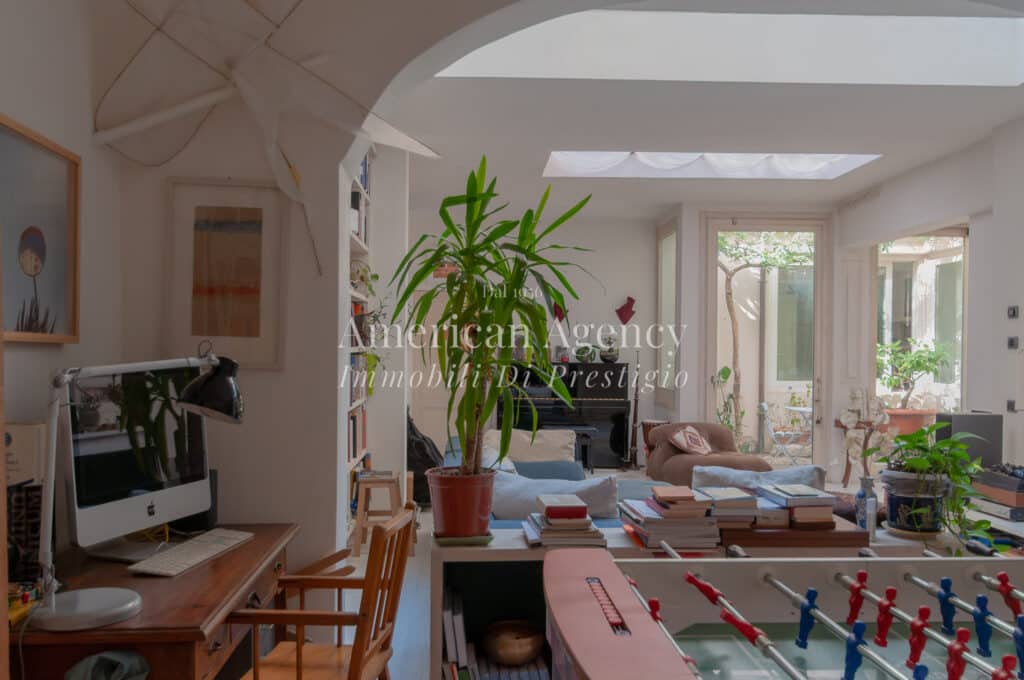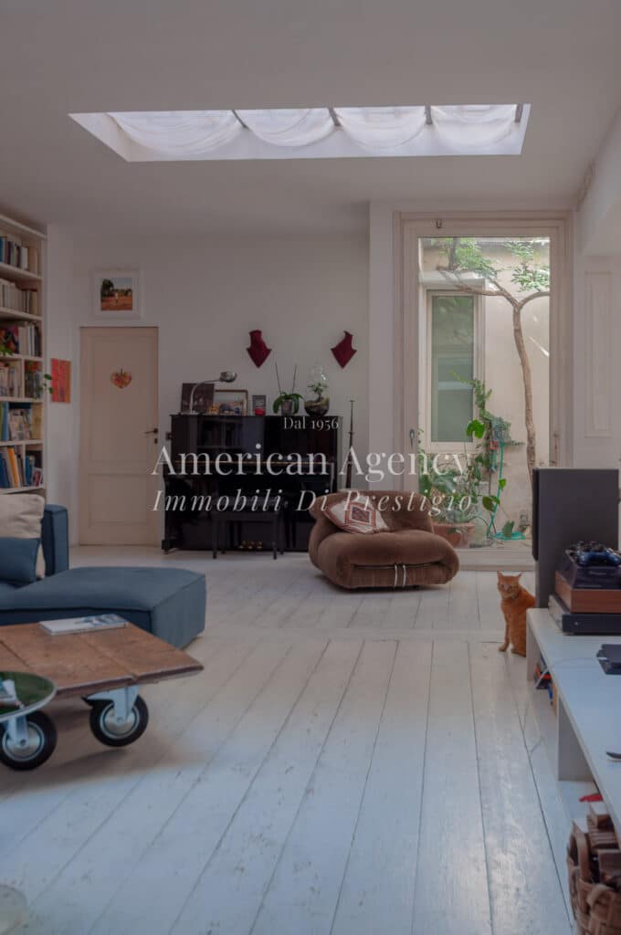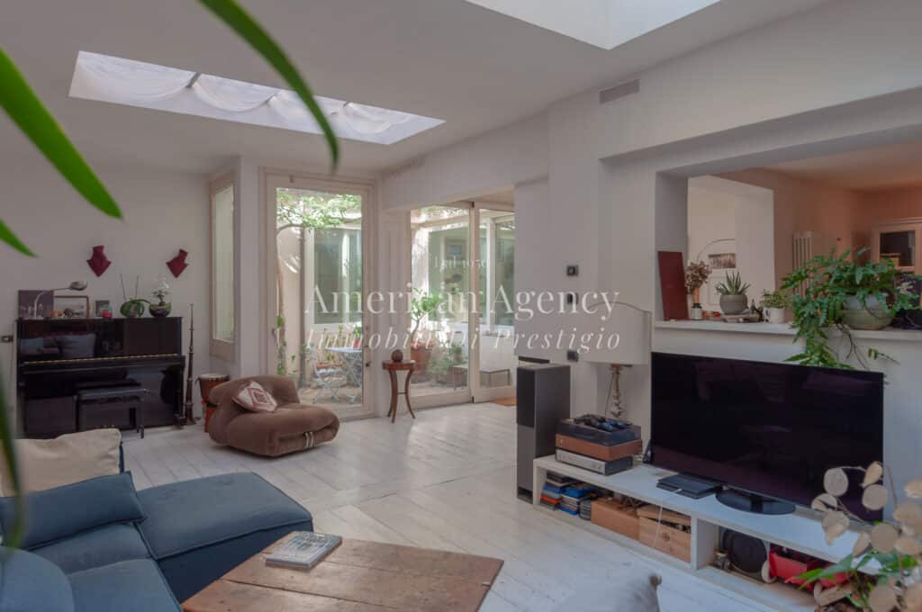 L’appartamento si sviluppa su due livelli collegati con armonia e naturale fluidità. Al piano terra, un grande ingresso introduce a un soggiorno doppio di rappresentanza, ampio e luminoso, che si apre verso la corte privata, vero cuore verde della casa.
