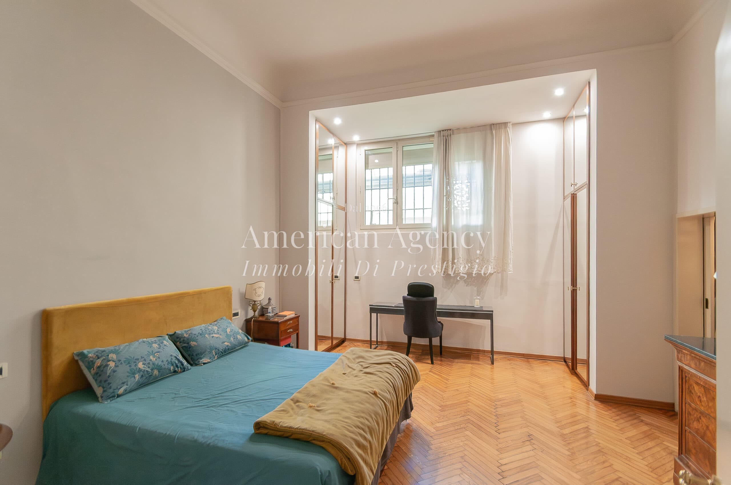 La zona notte al piano principale comprende due spaziose camere da letto, una dotata di cabina armadio e l’altra con armadiature su misura, oltre a due bagni rifiniti con materiali di qualità. Gli infissi di ottima fattura e le porte realizzate su misura contribuiscono a valorizzare ulteriormente l’abitazione. L’appartamento è inoltre dotato di sistema di allarme e riscaldamento autonomo.