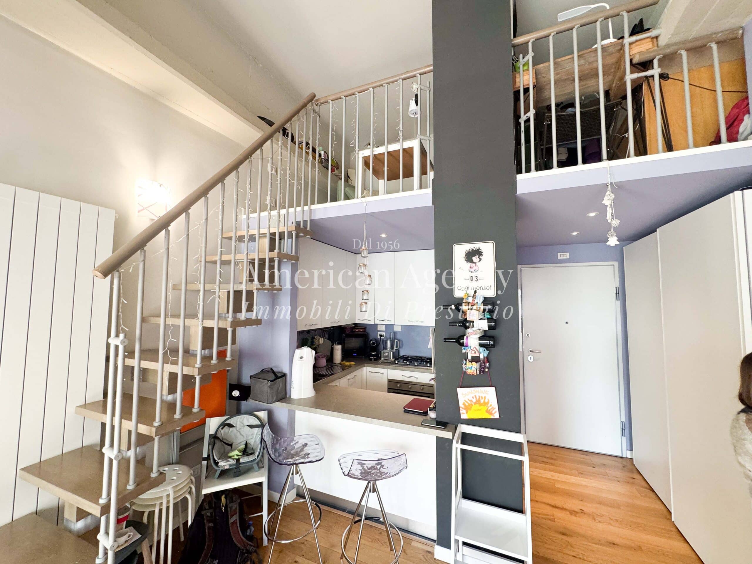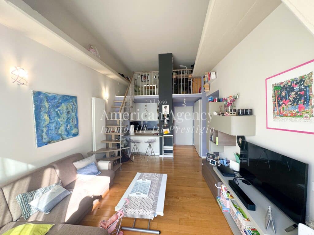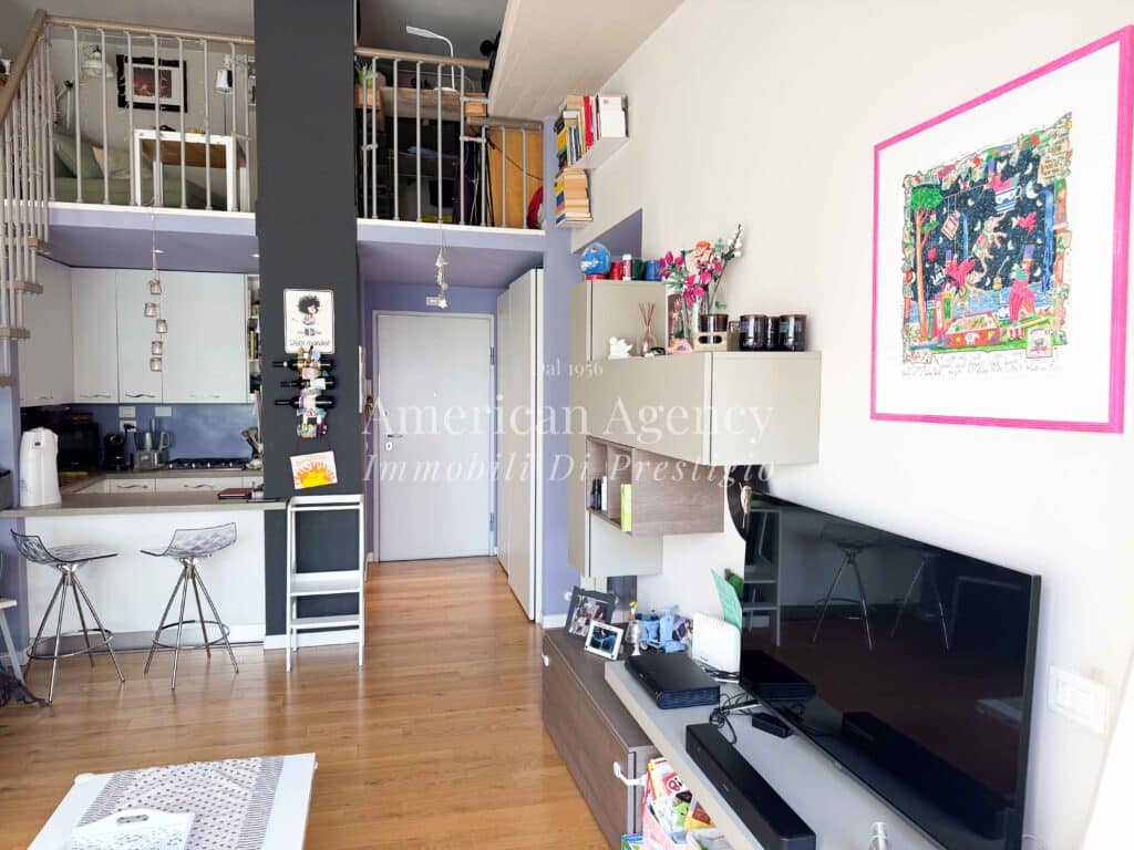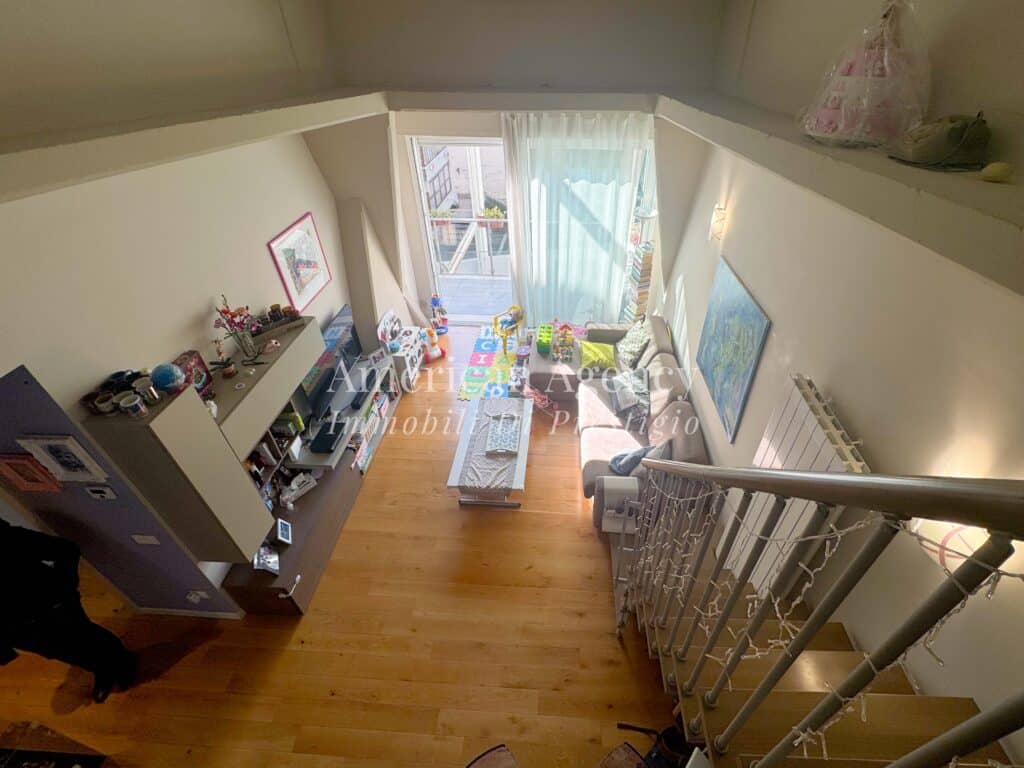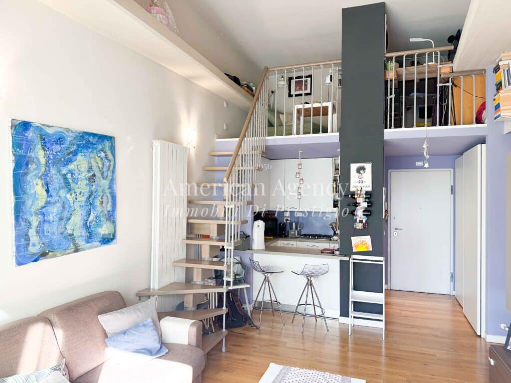 L’ingresso conduce alla zona cucina con ampio angolo cottura, separata dal soggiorno tramite un suggestivo salotto soppalcato. Questa soluzione architettonica dona movimento agli ambienti e valorizza le altezze dell’abitazione, creando uno spazio accogliente e moderno.