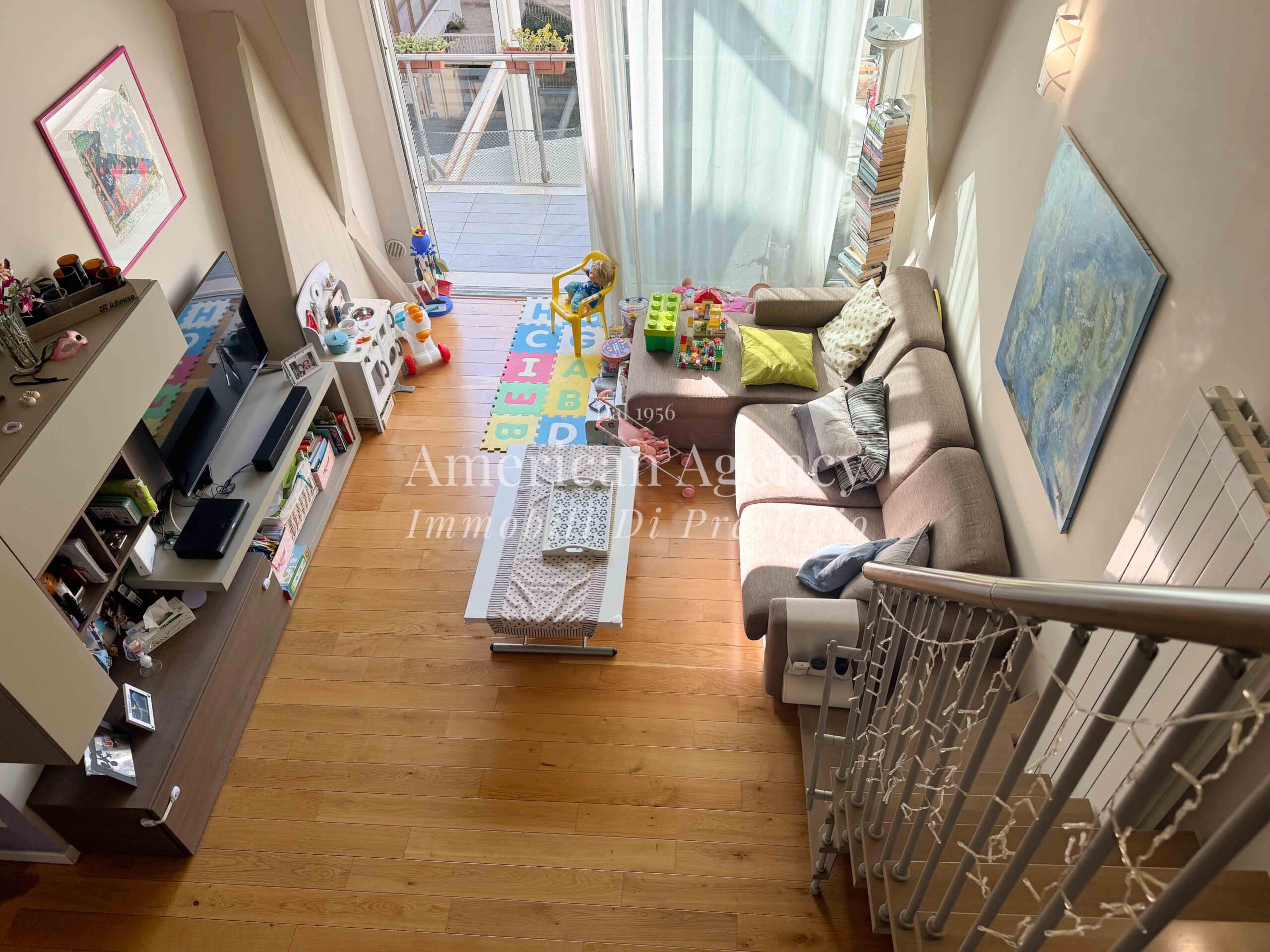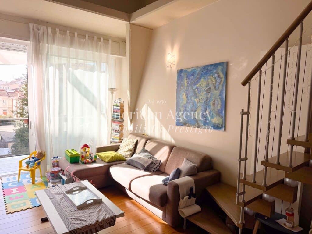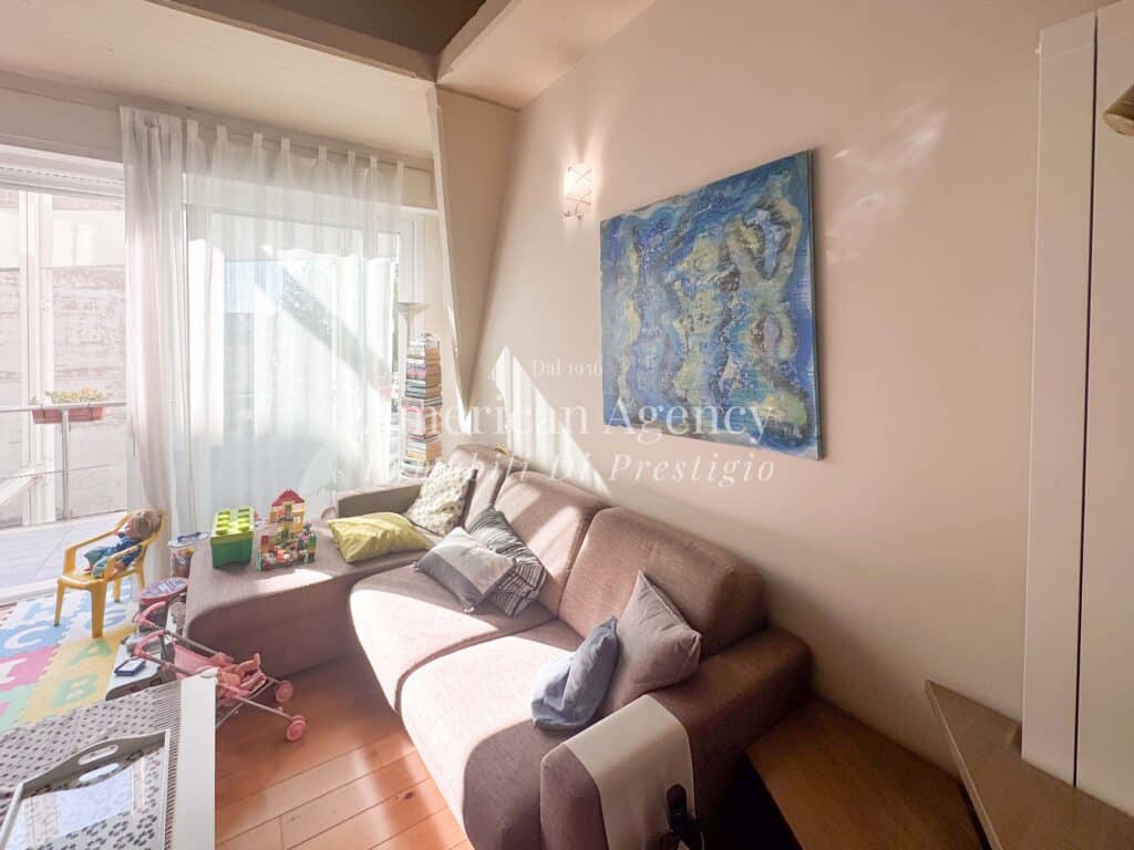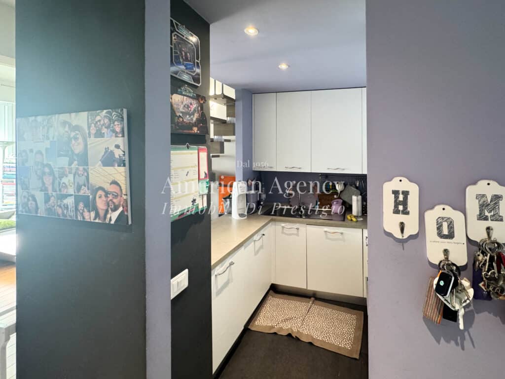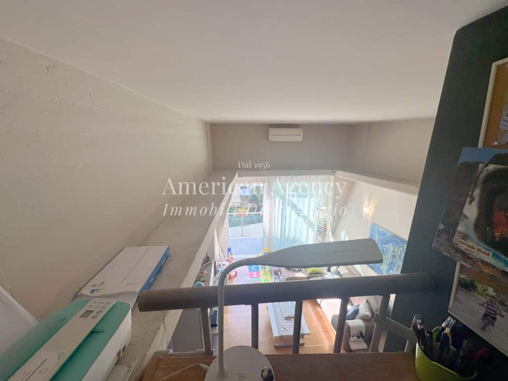 L’ingresso conduce alla zona cucina con ampio angolo cottura, separata dal soggiorno tramite un suggestivo salotto soppalcato. Questa soluzione architettonica dona movimento agli ambienti e valorizza le altezze dell’abitazione, creando uno spazio accogliente e moderno.