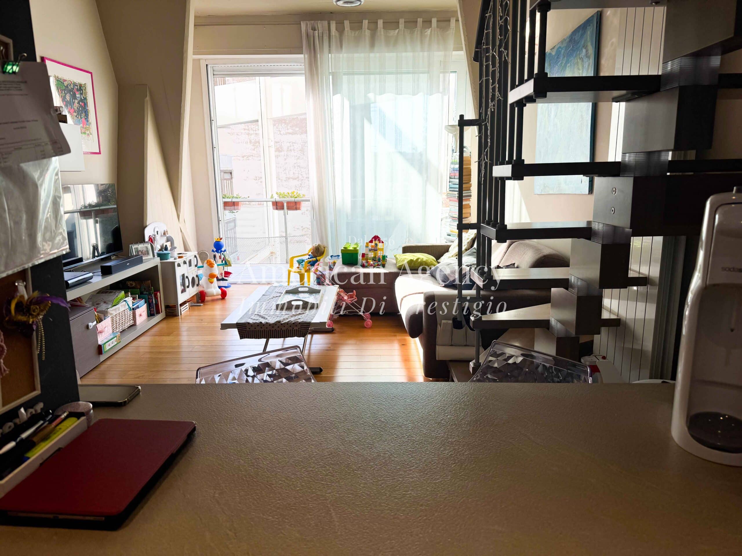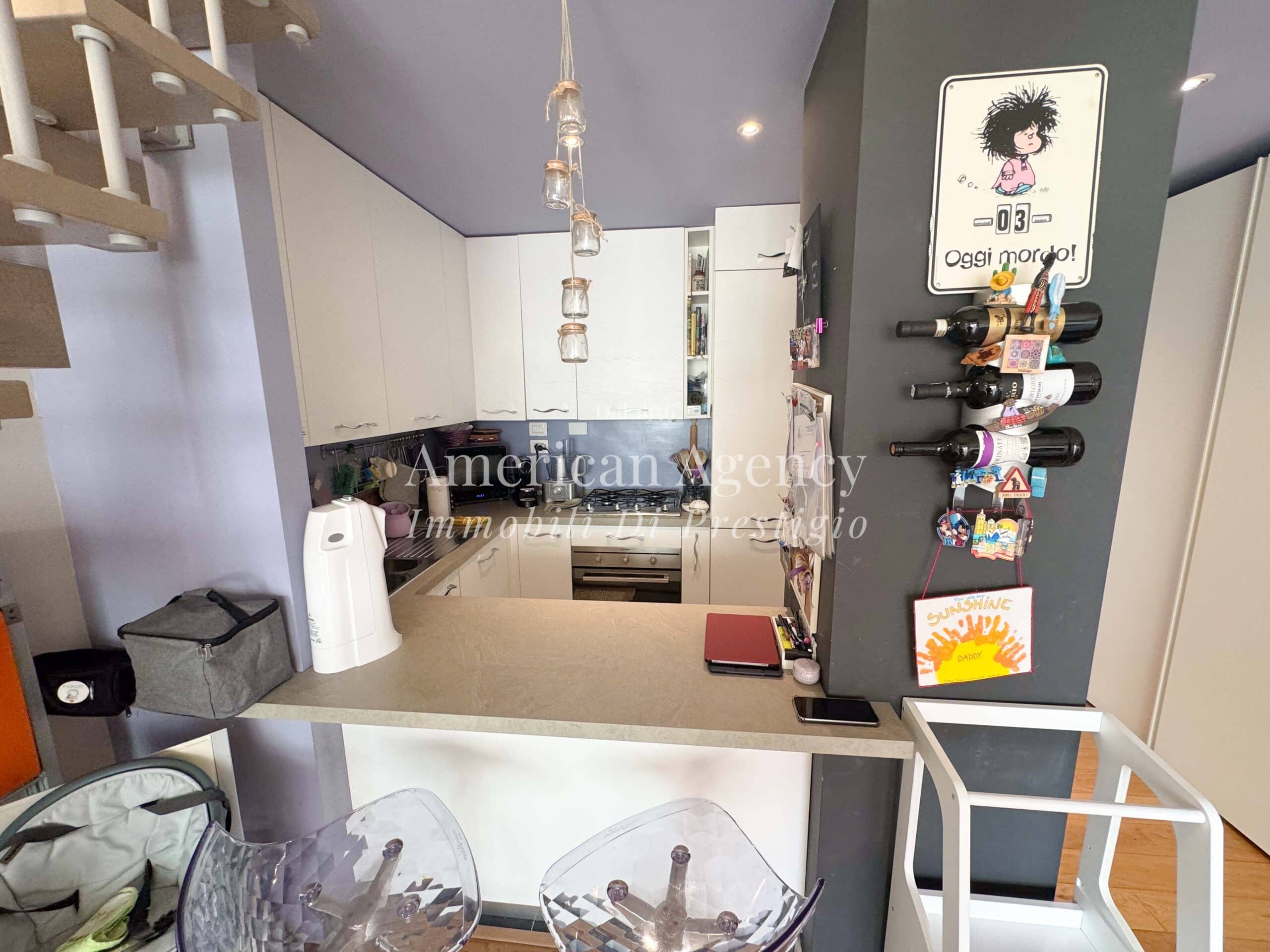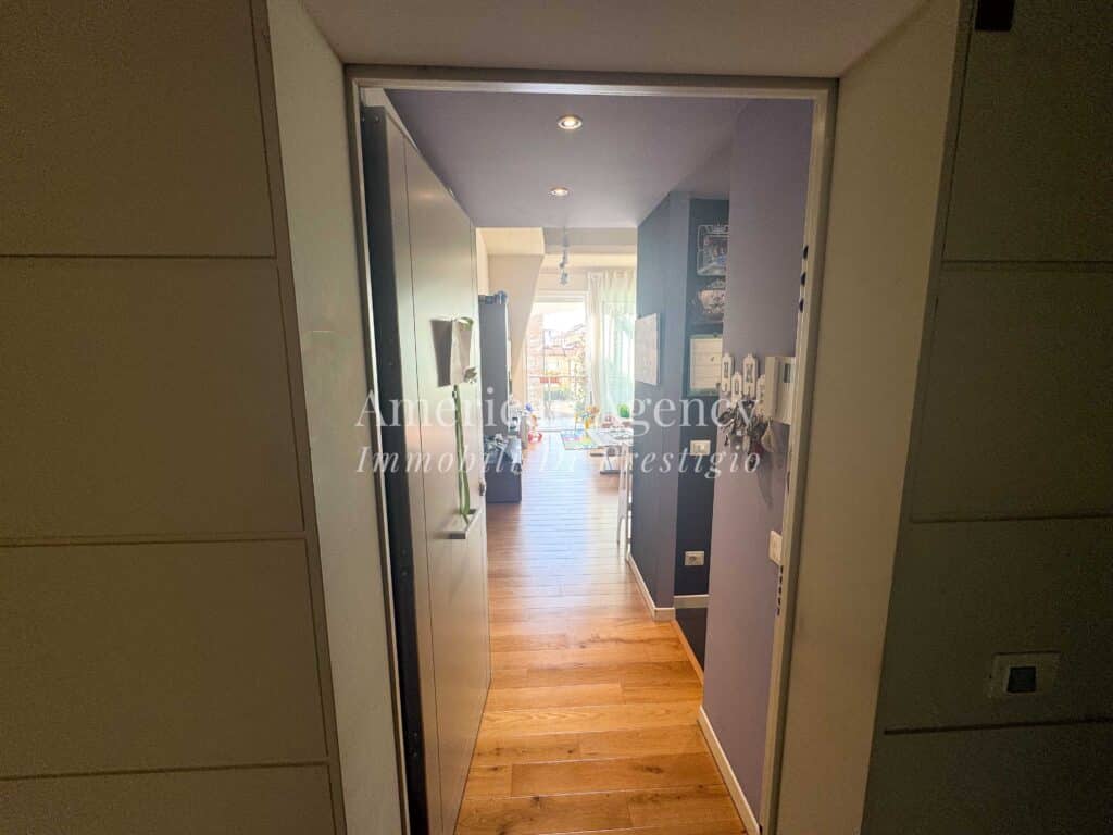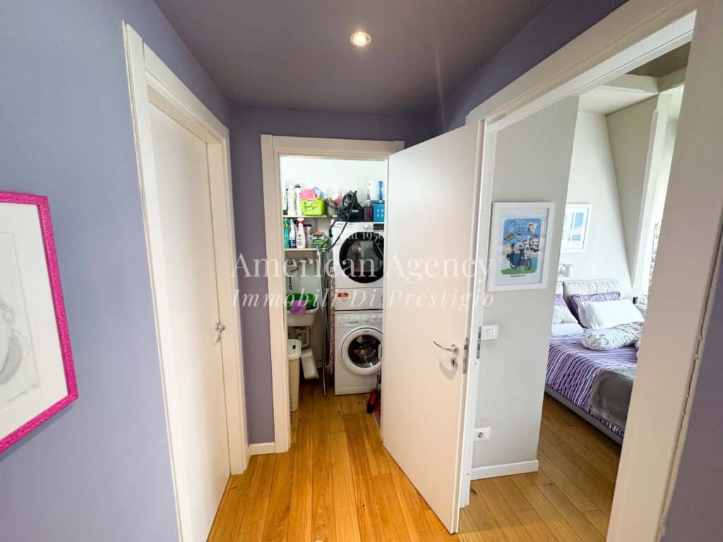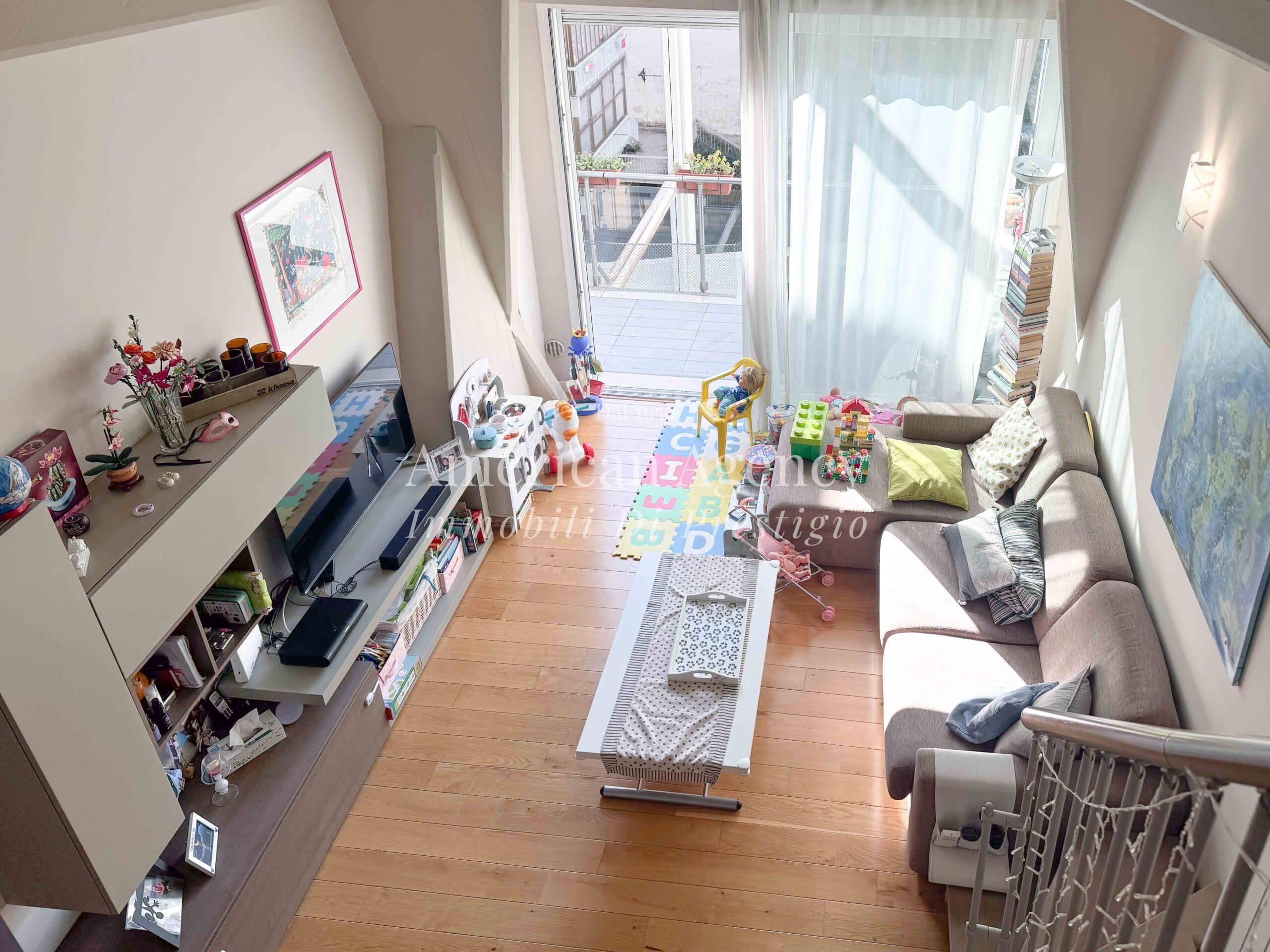 L’ingresso conduce alla zona cucina con ampio angolo cottura, separata dal soggiorno tramite un suggestivo salotto soppalcato. Questa soluzione architettonica dona movimento agli ambienti e valorizza le altezze dell’abitazione, creando uno spazio accogliente e moderno.