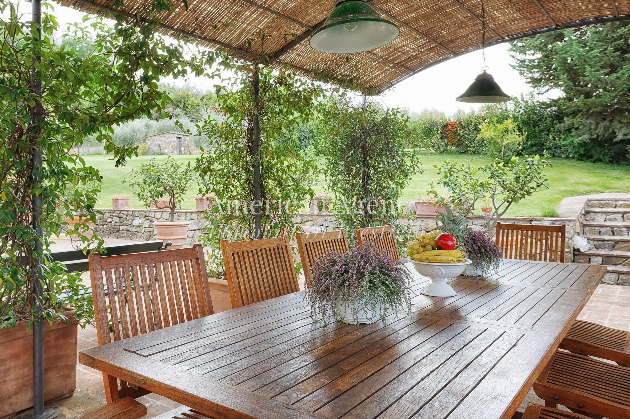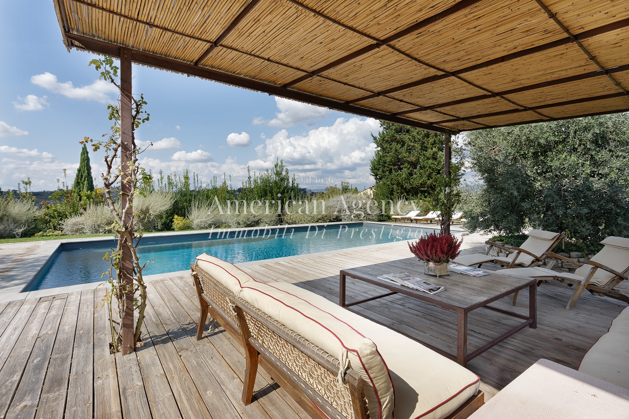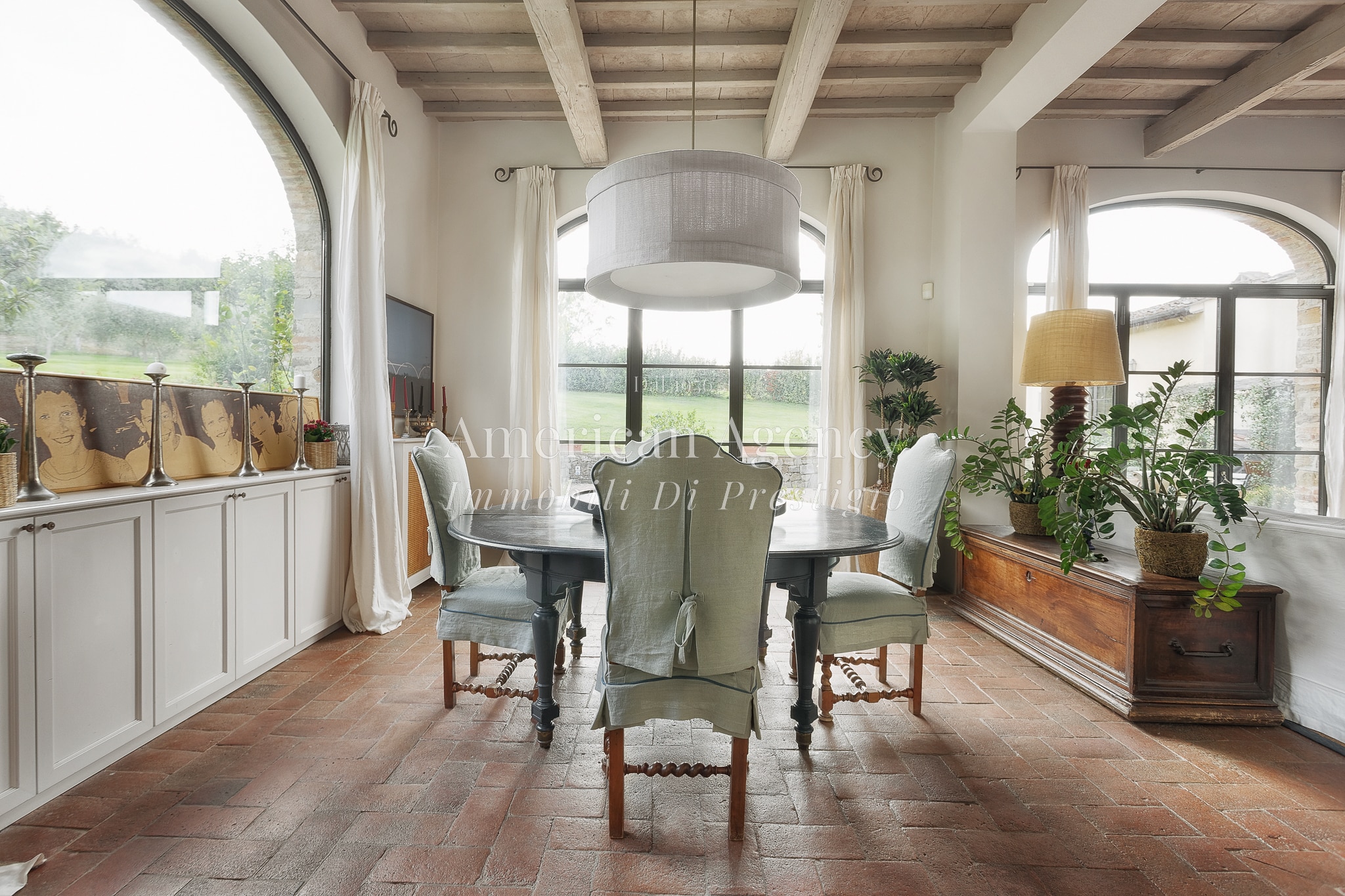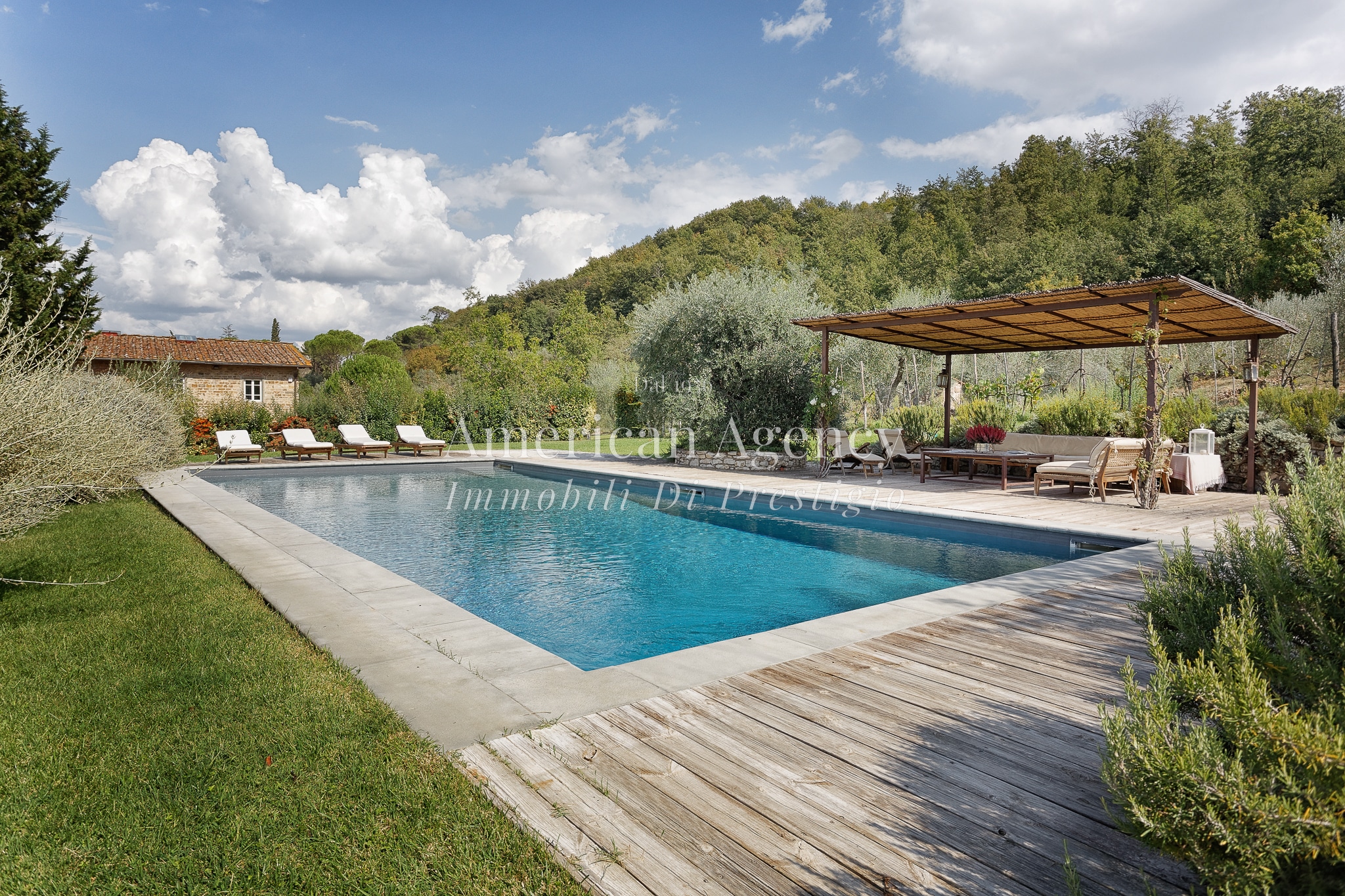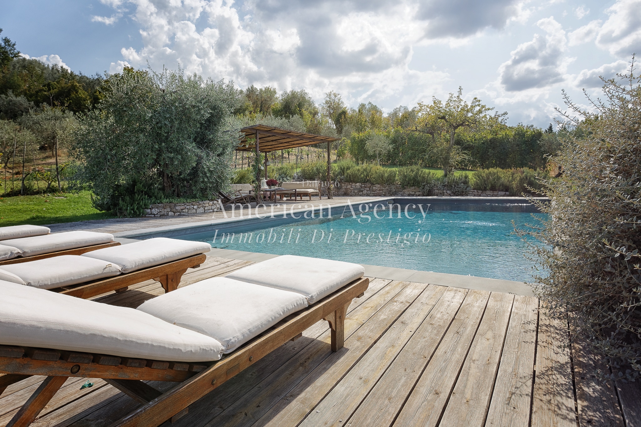 All’esterno, il parco con uliveto, prato all’inglese e vegetazione mediterranea regala un’atmosfera di assoluta privacy e relax. La piscina panoramica, perfettamente attrezzata, offre una vista meravigliosa sulle colline toscane, ideale per momenti conviviali o per chi cerca una seconda casa immersa nella natura.