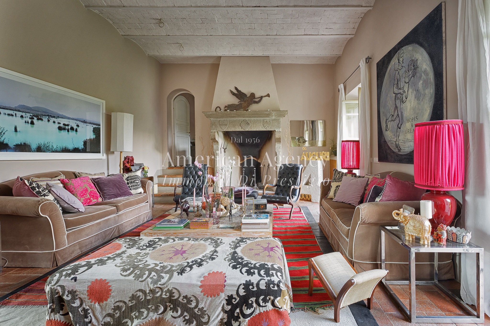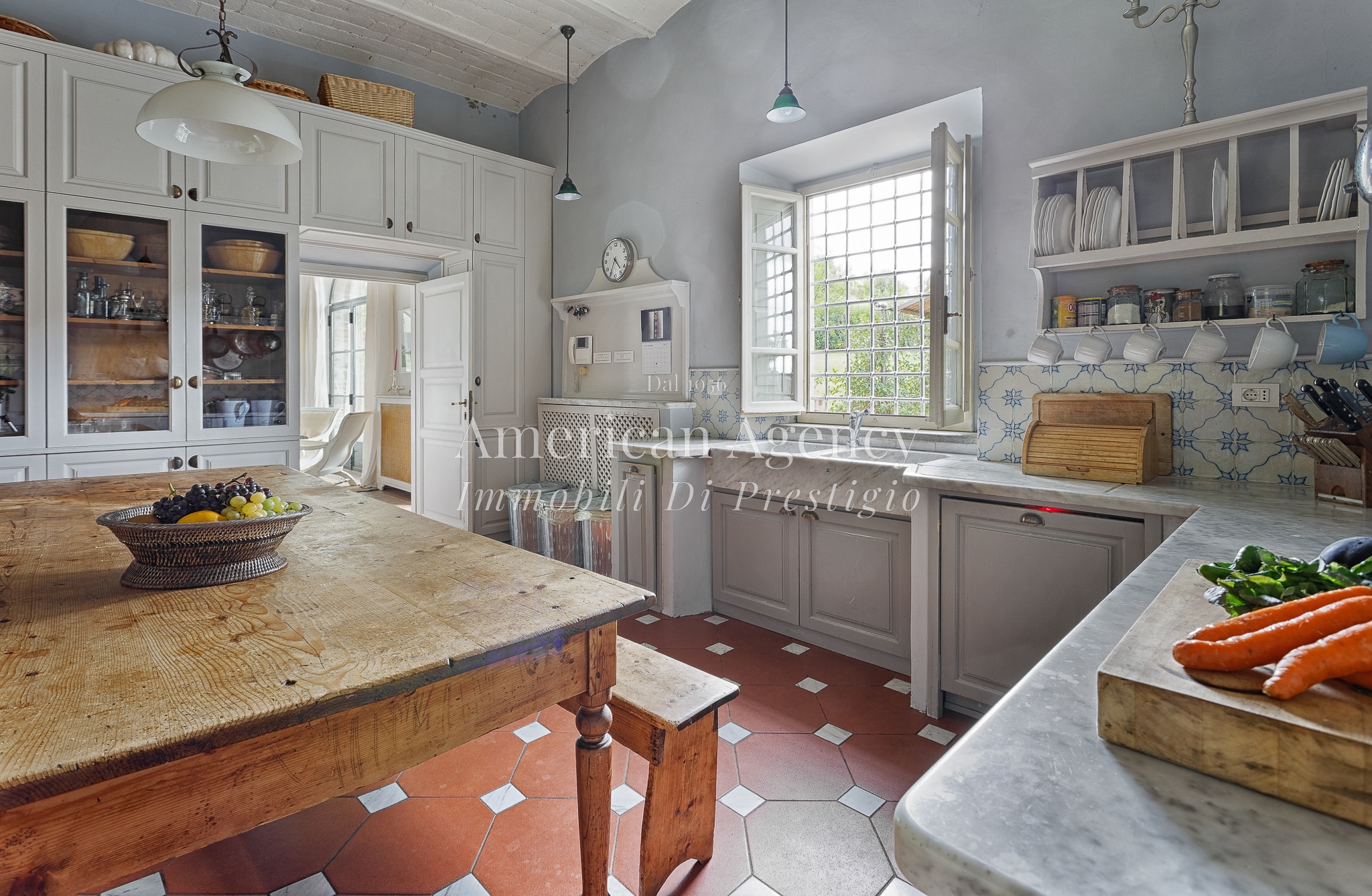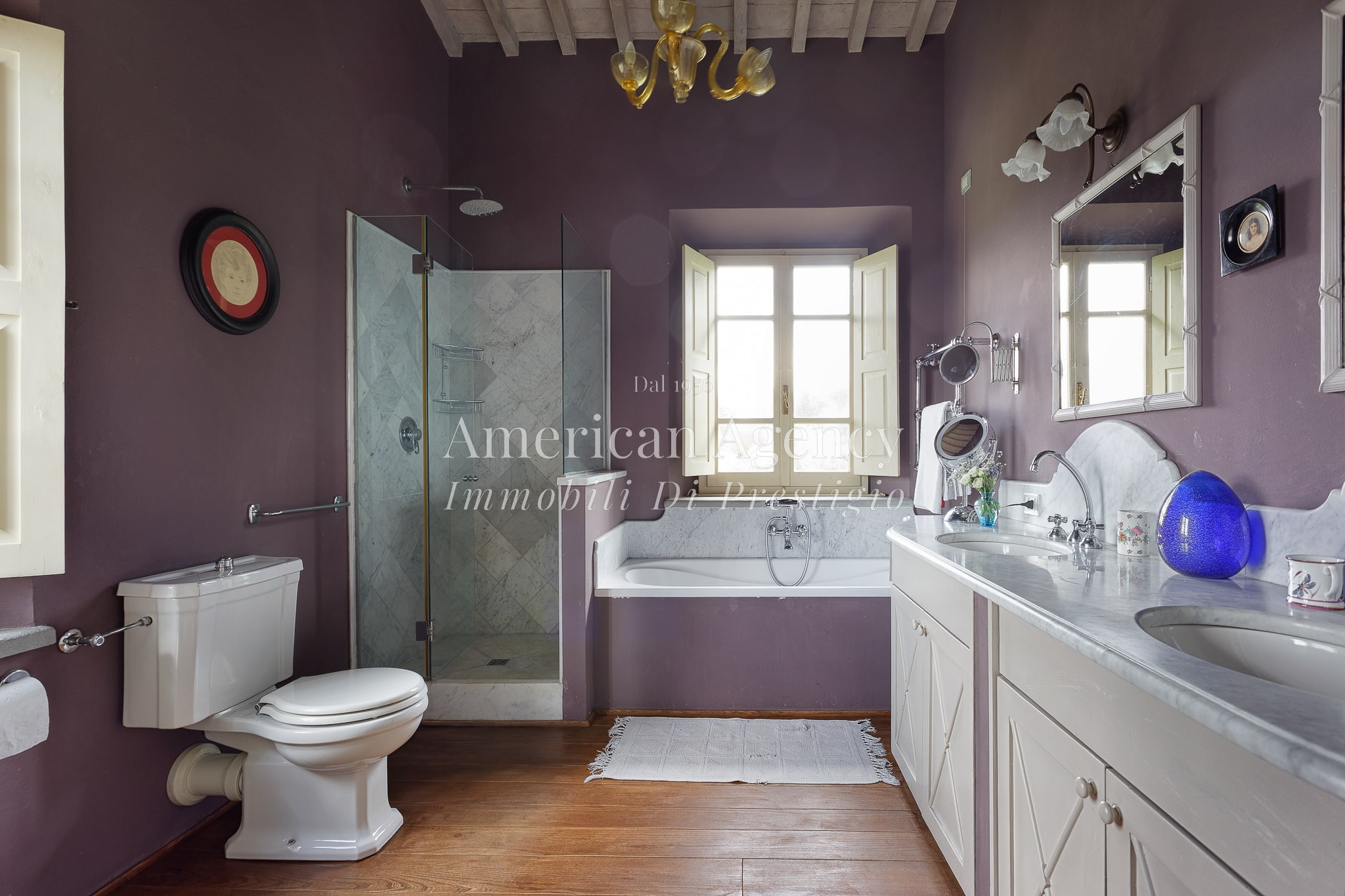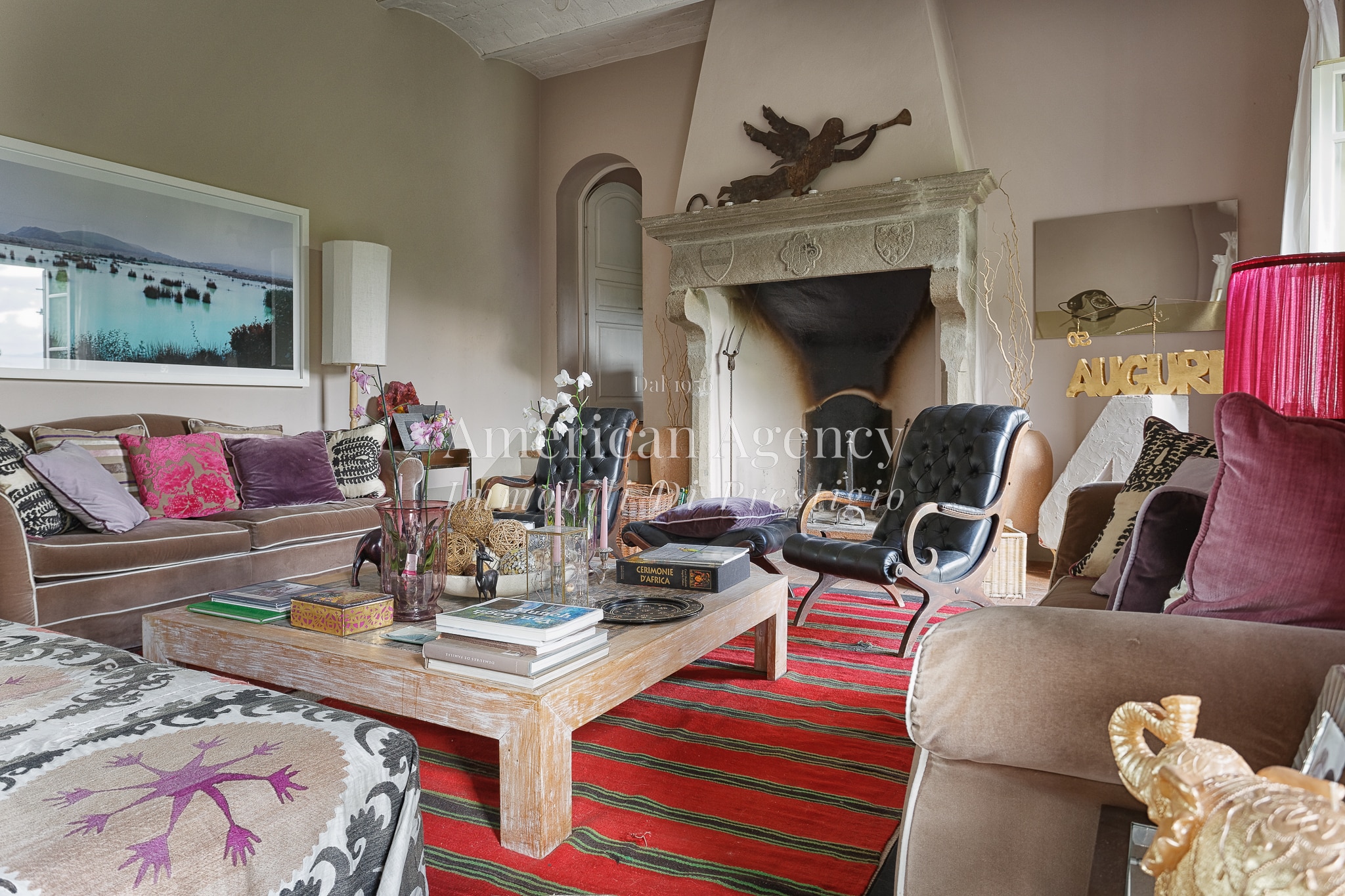 La villa principale, di circa 330 m², si sviluppa su tre livelli. Al piano terra si apre una luminosa zona giorno con camino, sala TV, ampia cucina abitabile, dispensa e bagno di servizio. Il primo piano ospita cinque camere matrimoniali e quattro bagni, tutti ristrutturati con materiali di pregio. Il piano seminterrato include uno studio, lavanderia, una camera singola con bagno privato e una cantina.