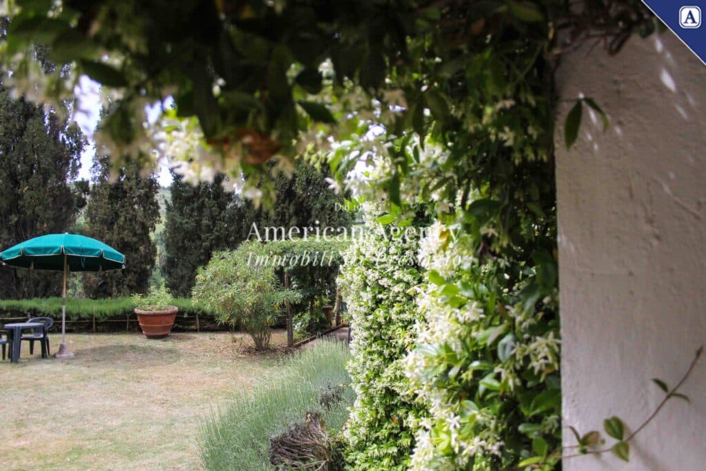 I terreni circostanti comprendono tre ettari di vigneto specializzato (80% Sangiovese, 10% Merlot, 10% Petit Verdot) e due ettari di oliveto con circa 400 piante in piena produzione. Il giardino, riccamente piantumato con oltre 1.800 essenze ornamentali, ospita una piscina panoramica di 10×7 metri.